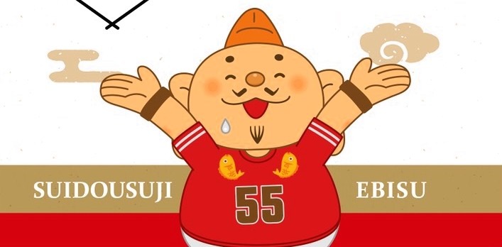 水道筋恵比寿神社のキャラクター「水道筋 汗かきえびす」は、なんとアメリカンフットボールのユニフォームを着ています。